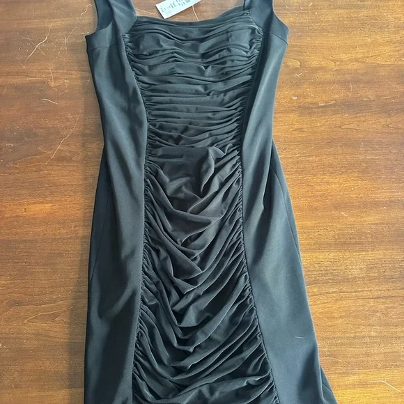 Form-fitting mini dress with gathered ruched front panel. Sleeveless with broad straps for a sleek neckline. Smooth side panels create a slimming silhouette. Classic black for easy styling day or night.