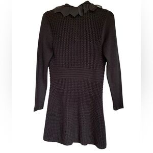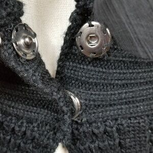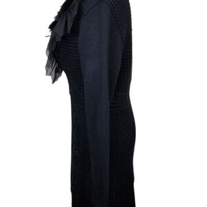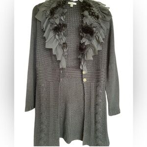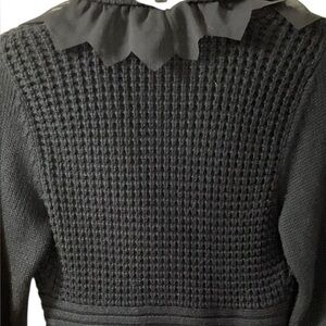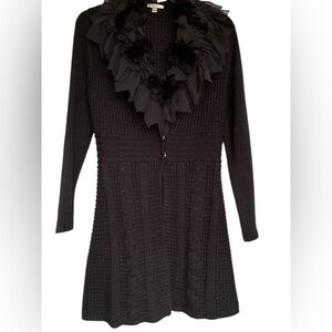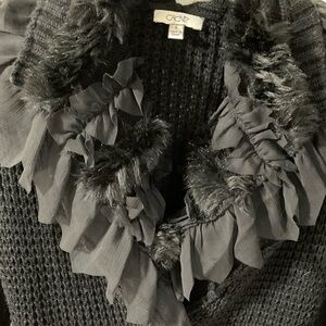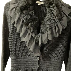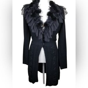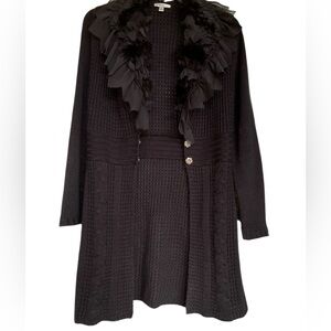 Elegant black cardigan with ruffled trim. Perfect for layering. Stylish and chic.