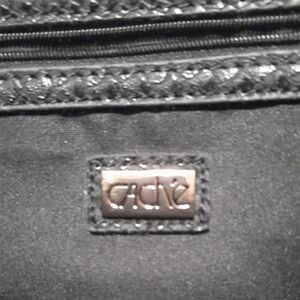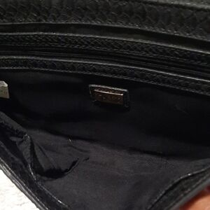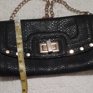 Stylish black clutch with textured design. Features a gold chain strap and secure clasp. Perfect for evening outings.