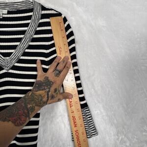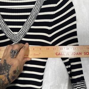 Cache Black & White Striped Sweater Deep V-Neck 3/4 Bell Sleeve Size M Y2K