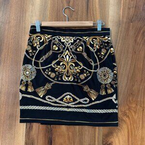 Versace style. Elegant mini skirt with intricate gold patterns. Features ornate designs and tassel details.
