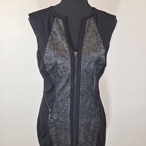 Elegant sleeveless dress by Cache. Features a stylish black and gray pattern. Perfect for any occasion.