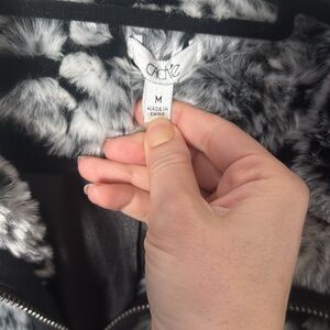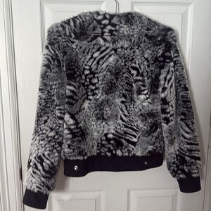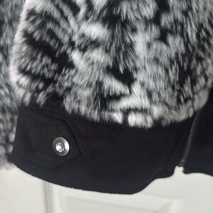 Luxurious faux fur jacket with striking black and white pattern. Oversize collar with gem detailing on bottom. Black and white zebra print. Gem Detail zipper closure. Excellent condition. Cache size 6. Smoke free home.