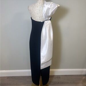 Elegant one shoulder dress by Cache. Features a striking black body with a contrasting white shoulder detail. Perfect for formal occasions.