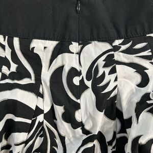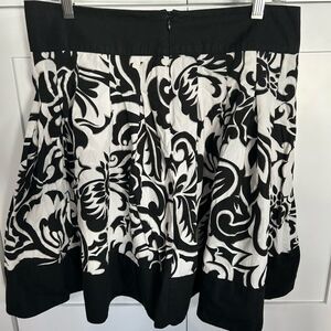 Skirt has a beautiful design with silver accents through it and a zipper in the back. It is pleated in the front and flares out.