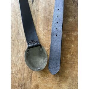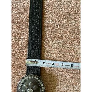 Vintage-style black leather belt by Cache size L/XL made in Canada from Italian leather features an ornate floral silver-tone buckle with rhinestones. Total length approx. 39.5”, width approx. 2”. Decorative embossed pattern along the strap. Please note: the belt sits crooked and feels uncomfortable when worn. This issue is hard to capture in photos but affects fit.