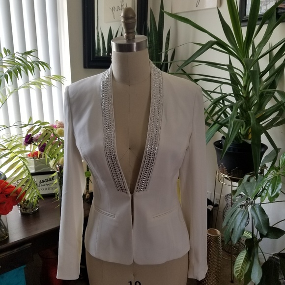 NEVER WORN W/TAG. White crisp blazer with clean lines, quality material, satin lining, and silver studs around the neckline. Great for work, an evening out, or dressing up a weekend look. This little blazer is still very trendy and current, while having the classic Cache fit and quality!