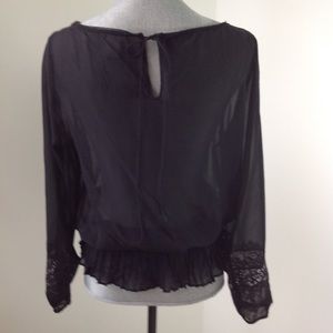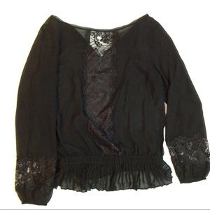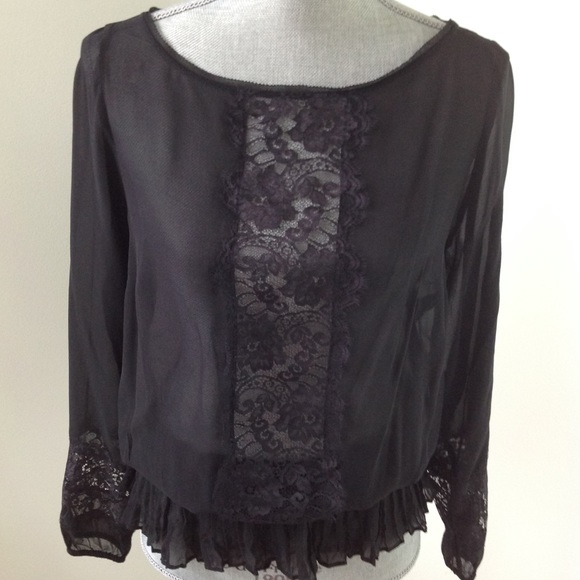 Beautiful black, lace adorned blouse with tie black closure. 23 inch sleeve with 20 inch bust area. There is elastic stretch at the waist. Blouse measures 24 1/2 inches long. 100% silk