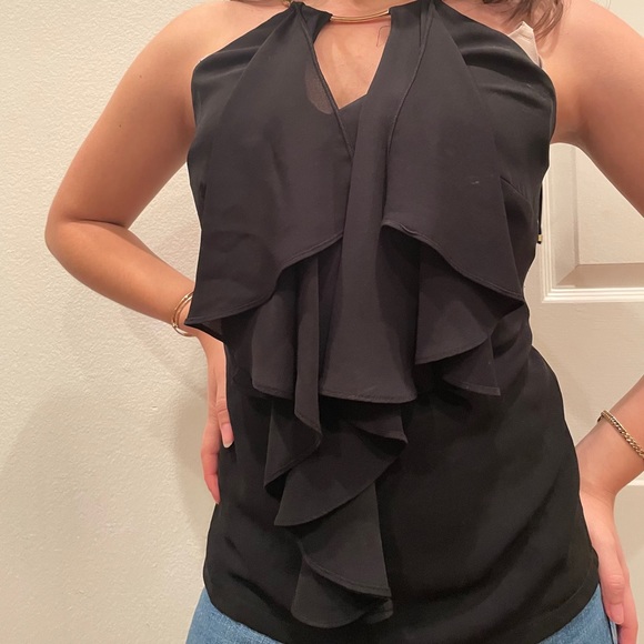 Cache sleeveless black Blouse with gold around the collar. Perfect for a night out on the town