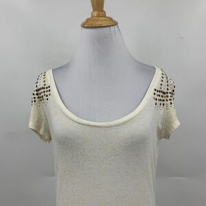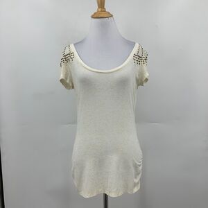 CACHE BLOUSE WOMEN S SMALL IVORY GOLD STUDDED EMBELLISHED SCOOP NECK RUCHED SIDE