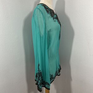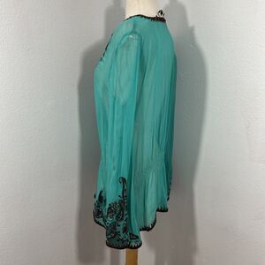 Cache Blouse Womens S Green Silk Sheer Embroidered Boho Peasant Top