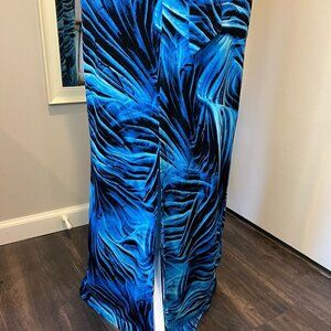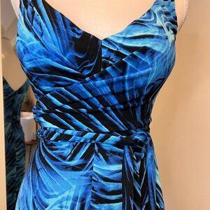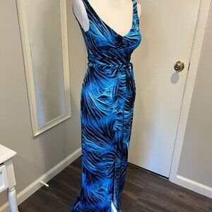 Cache Blue & Black Tropical faux wrap maxi dress, Size XS