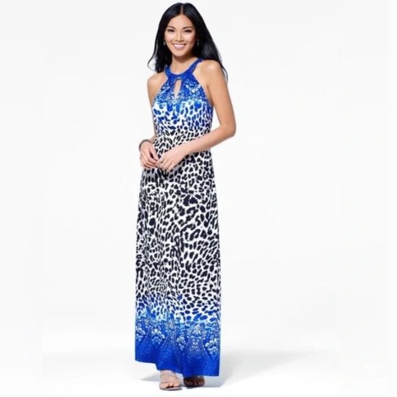 Cache Blue, Black, and White Paisley & Animal Print Halter Maxi Dress - Size M