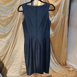 This elegant Cache dress in blue is designed for cocktail occasions. It features a sleeveless, scoop neck style and a modern sheath silhouette. The midi length adds sophistication, making it a perfect choice for a night out.