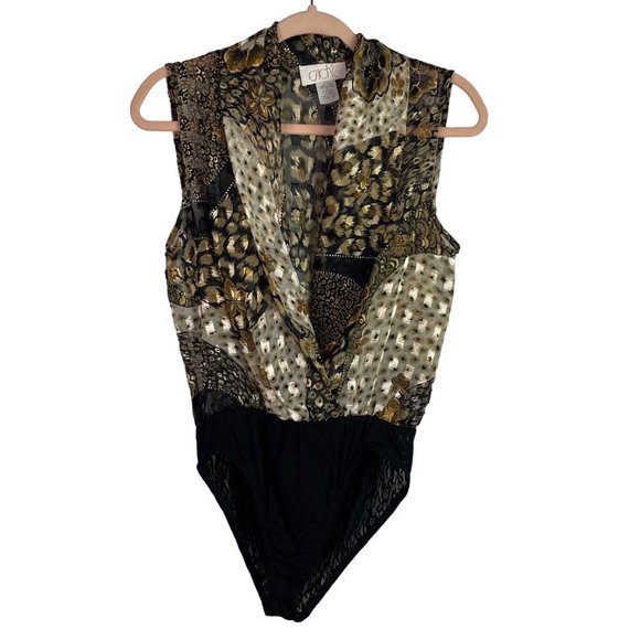 Cache Bodysuit Vintage 10 Black Gold Animal Print Floral Sleeveless Plunge Neck