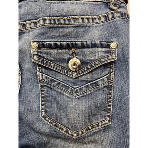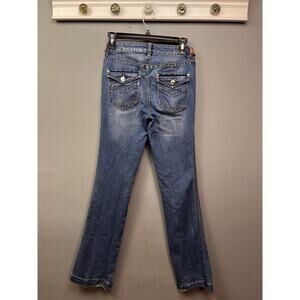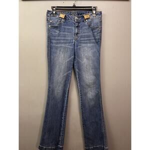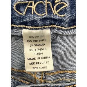Cache Boot Cut Denim Jeans Womens size 4 Flap Pockets Distressed Stretch Classic