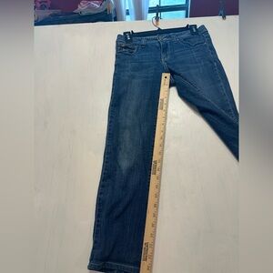 Step out in style with these stunning Cache women’s jeans in a size 2. These dark wash jeans feature a flattering bootcut leg and mid-rise waist, perfect for pairing with heels or boots. The standout detail is the beautifully embellished back pockets with rhinestones and embroidery, adding a touch of glam to your everyday denim.