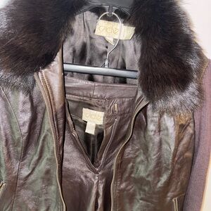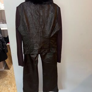 Elegant Deep Chocolate leather pants suit with sweater jacket trimmed with fur. The jacket is a Large, the pants are a 10.