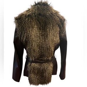 Crafted from supple, high-quality 100% leather in a rich chocolate brown, this jacket features a plush faux fur collar and back panel that add warmth, texture, and a touch of glam.