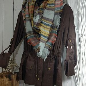 This chocolate brown linen jacket is no exception. Stunning deep chestnut brown linen jacket by Cache, adorned with gold zipper, hardware and accent pieces. Three quarter length roll up sleeves can be fastened up or worn down. Jacket can be worn zipped up for a cowl neck effect, or down; shown both ways. Double breasted with faux pockets, usable real hand pockets on the bottom. Elasticated cinched waist detailing, to create and showcase that beautiful silhouette for a pulled together and elegant vibe. Pair with an autumnal scarf, or a solid color scarf for a pop of color against this beautiful, rich brown tone.