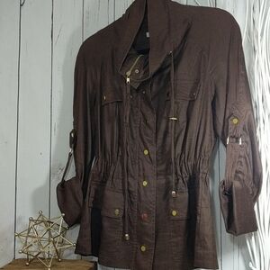 Cache Brown Linen Lightweight Fall Jacket Gold Accents XS Quiet Luxury Rich NWT