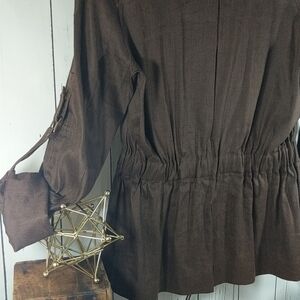 This chocolate brown linen jacket is no exception. Stunning deep chestnut brown linen jacket by Cache, adorned with gold zipper, hardware and accent pieces. Three quarter length roll up sleeves can be fastened up or worn down. Jacket can be worn zipped up for a cowl neck effect, or down; shown both ways. Double breasted with faux pockets, usable real hand pockets on the bottom. Elasticated cinched waist detailing, to create and showcase that beautiful silhouette for a pulled together and elegant vibe. Pair with an autumnal scarf, or a solid color scarf for a pop of color against this beautiful, rich brown tone.