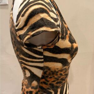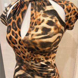 This Cache dress is perfect for a night out, featuring a striking brown and black leopard print. The bodycon style hugs your curves, while the mock neck and cap sleeves add a touch of elegance. The keyhole cutout below the neckline offers a subtle yet sophisticated detail.