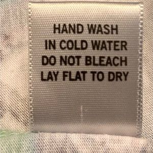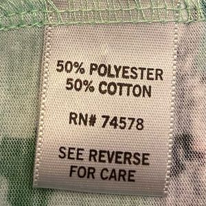 50% polyester, 50% cotton. Hand wash cold