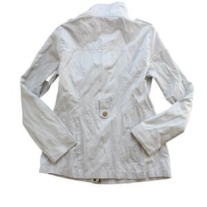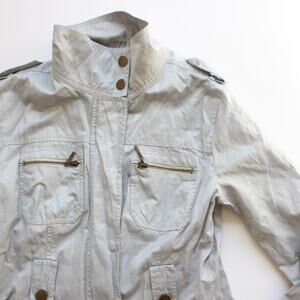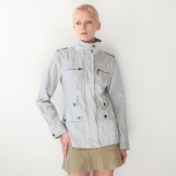 Vintage early 2000s silver-grey utility jacket by Cache Cache. High funnel collar with snap buttons, zip pockets, and a flattering fitted shape. Lightweight and perfect for layering. Rare French piece with Cop Copine vibes—very on-trend with the current indie sleaze & Y2K revival.