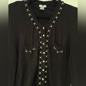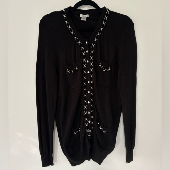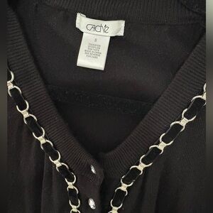Stylish black cardigan with chain accents. Perfect for layering.