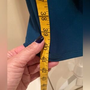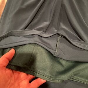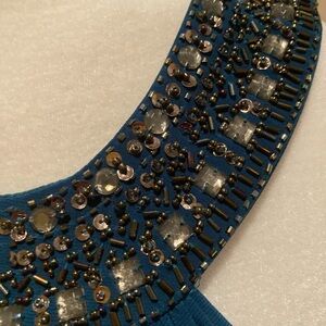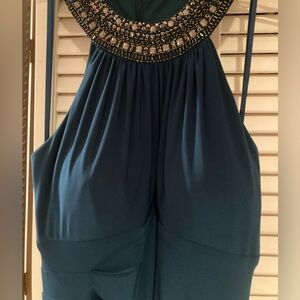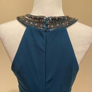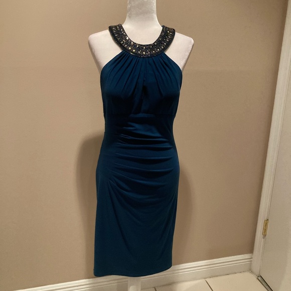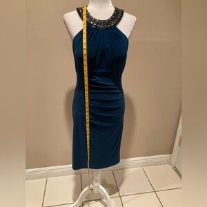 Beautiful, elegant cocktail dress in dark teal color. The dress is ruched at the right side, backside, and chest area. There are no missing rhinestones on the collar, no stains, or damage. The dress has an invisible back zipper, padded bra, and is fully lined.