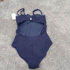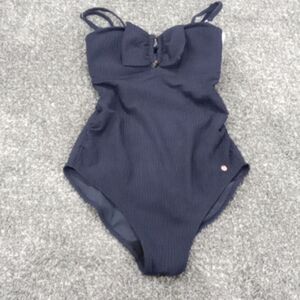 Cache Coeur navy blue Bamboo ribbed 1 piece maternity swimsuit. Adjustable & removable straps, side boning, bow betail with wooden ring and peekaboo back. size XS NWT