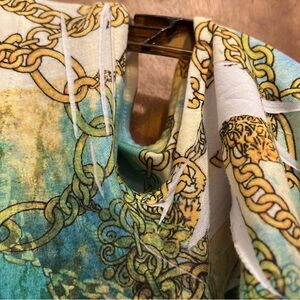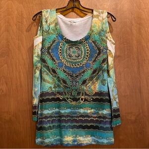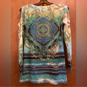 Vibrant 3/4 sleeve top with intricate chain design. Features shades of green and blue with embellishments on front. Very minimal pilling overall great condition.