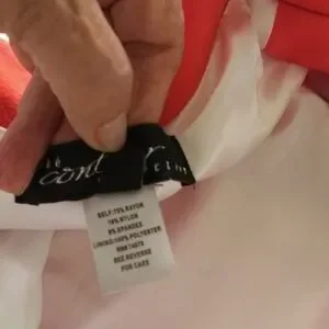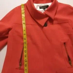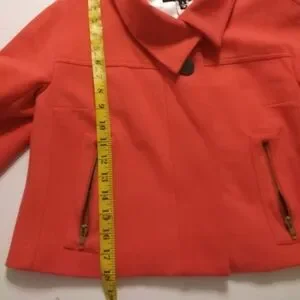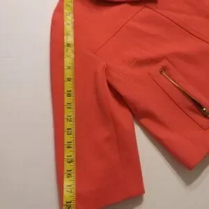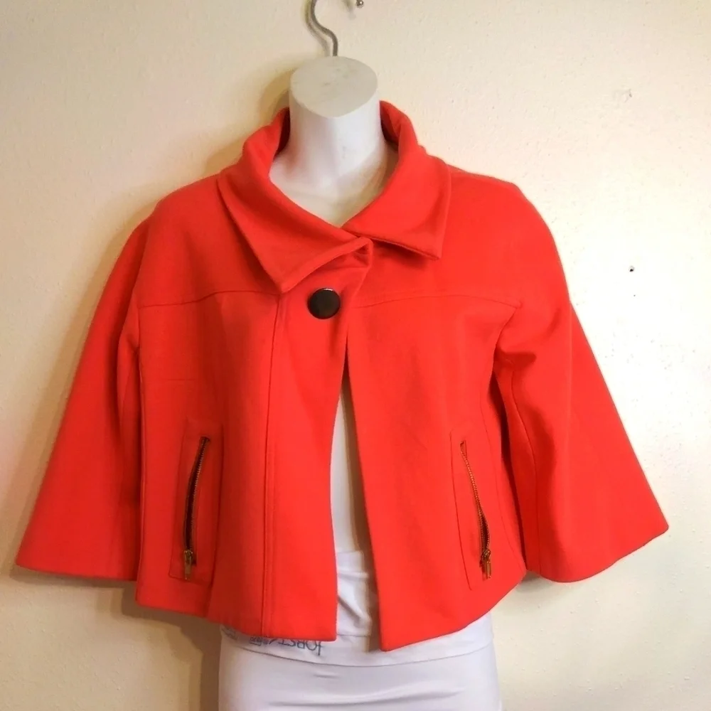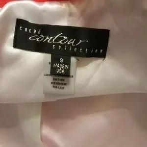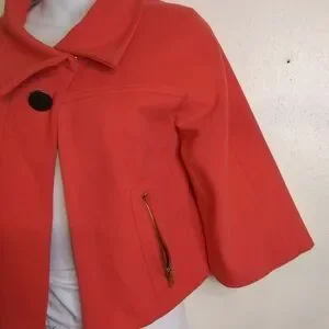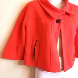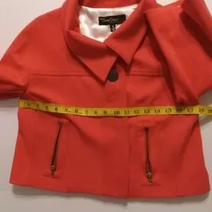 Cache Couture Color Pastel Orange/ Red one button Closure with 2 Small details pockets Cropped Blazer Made in USA Size Small Shell 75% Rayon. 14% Nylon 9% Spandex lining 100% Polyester RN# 74578