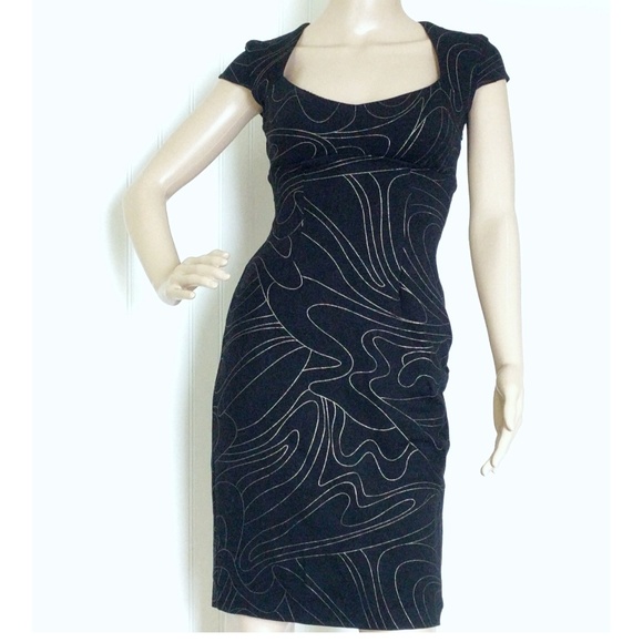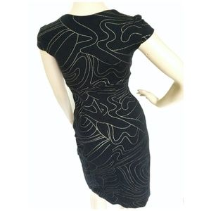 Cache Contour Collection Bodycon Dress in Black with Gold Swirl design. Size 2.