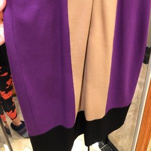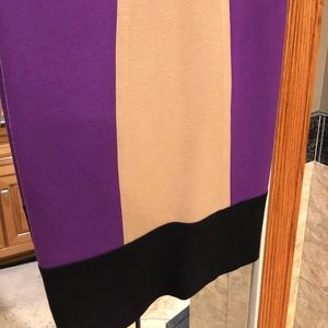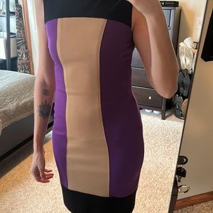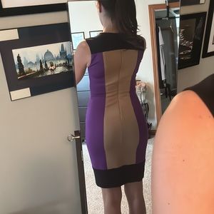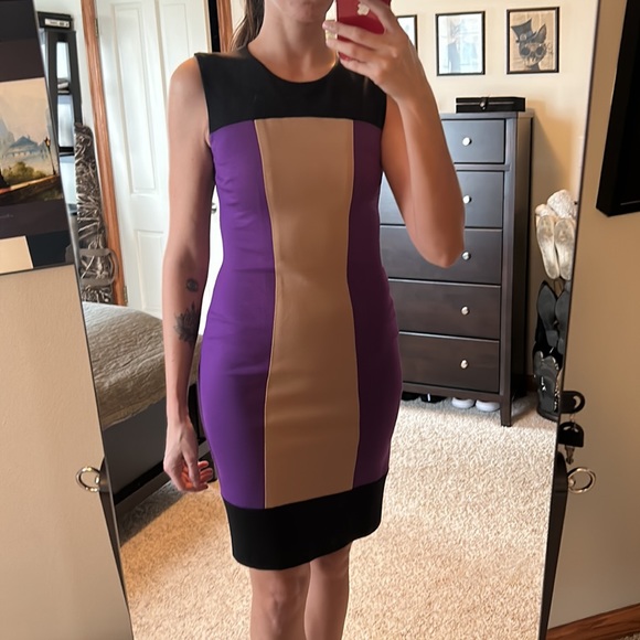 Purple, black, and mocha colorblock. Fitted. Beautiful on. Worn a handful of times. Nice at work. That’s how I wore it. With a little belt and nude heels. Sleeveless. Put a cute little black blazer or a leather jacket with it and you got a chic look.