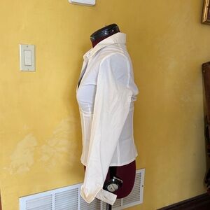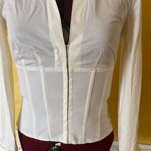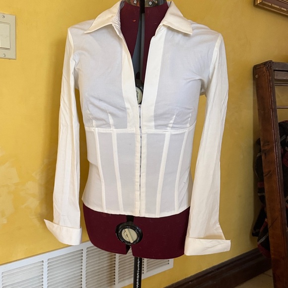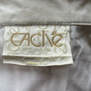 Stylish Cache Corset style button down shirt. Cream color with a tailored fit. Perfect for versatile wear.