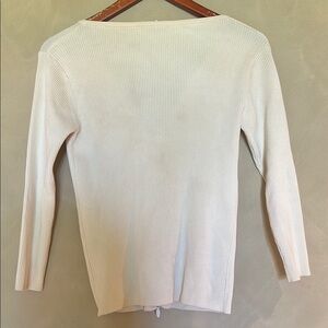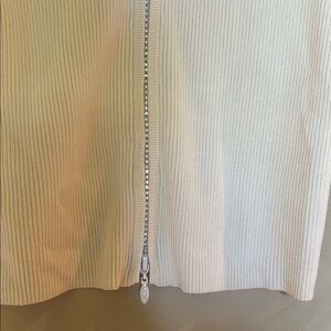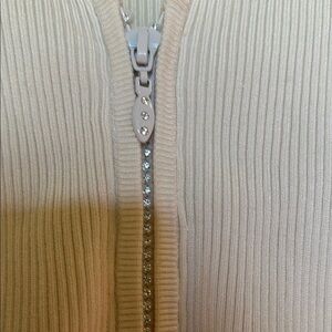 Elegant cream cardigan with ribbed texture. Ideal for layering.rhinestone zipper . 78% silk 22 % spandex.dry clean only . Excellent condition. Nonsmoking home