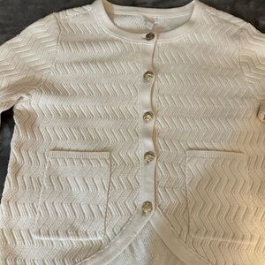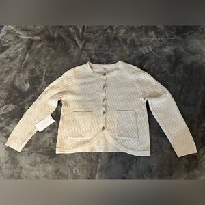 Elegant cream cardigan with textured pattern. Features gold buttons and front pockets. Perfect for layering.