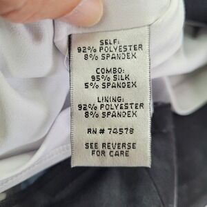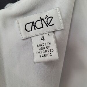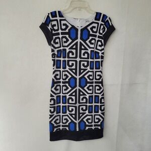 Keywords: Cache dress, geometric dress, black and white dress, blue dress, size 4 dress, fitted dress, short sleeve dress, career dress, party dress, silk dress, polyester dress, women's dress
