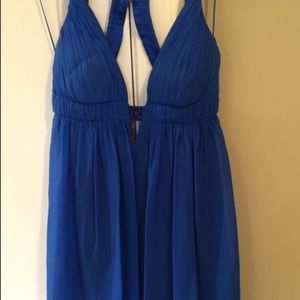 Royal blue. Great dress for a wedding or event. Fun and sexy cutouts!👗 Does have a small stain at the bottom of the dress which if you took to get dry cleaned should come out. Barely noticeable since the fabric is so dark.
