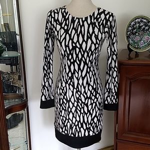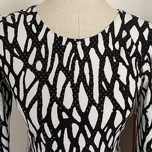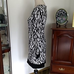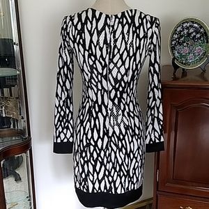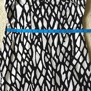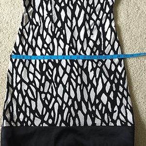 Super sharp dress by Cache in black and white with tiny light yellow dots that adhere to the dress. On the black the dots are shiny clear. It is lined, and zips in the back. Has black cuffs and border. Looks fantastic on. Under the left armpit some of the yellow dots have lost it's sheen but not noticable unless directly looking at it closeup. See measurements. Length is about 33.5".