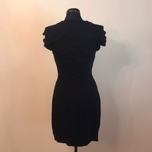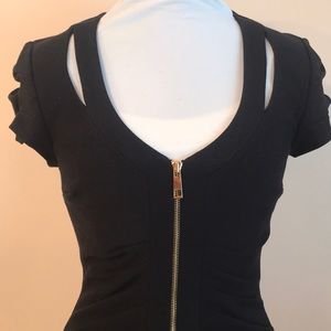 A beautiful little Black dress featuring a gold zipper and ruching at the waist. Open slits at the top on shoulder. Excellent condition. Would be stunning with heels or boots