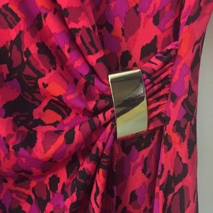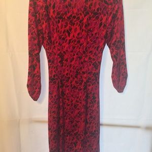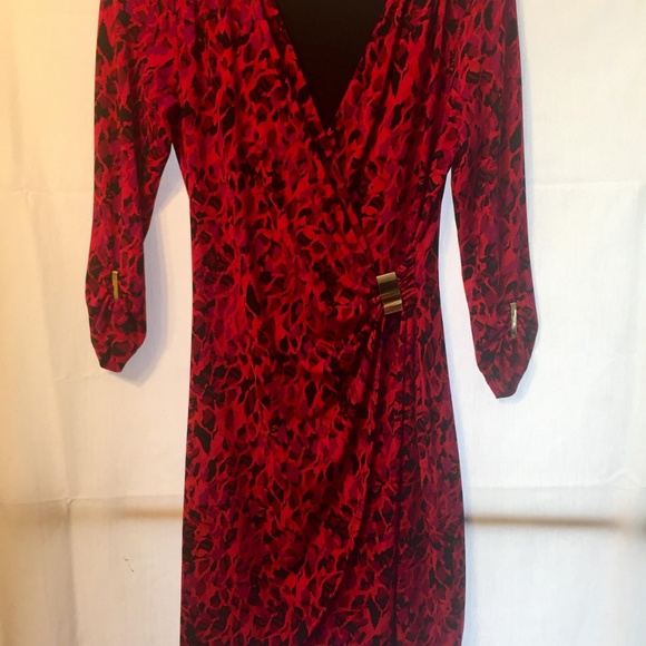 Beautiful fitting, multi color slimming slight stretch material, worn once. light machine wash, colors are gorgeous. Out of all of the pictures, the color of the dress is true to the picture of the sleeve.