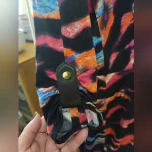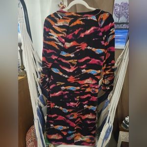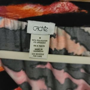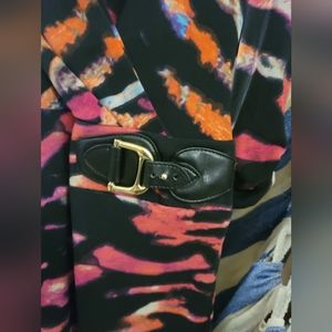 Cache dress. long sleeved, multi colored print, with leather accents on waist and sleeves. size medium.
