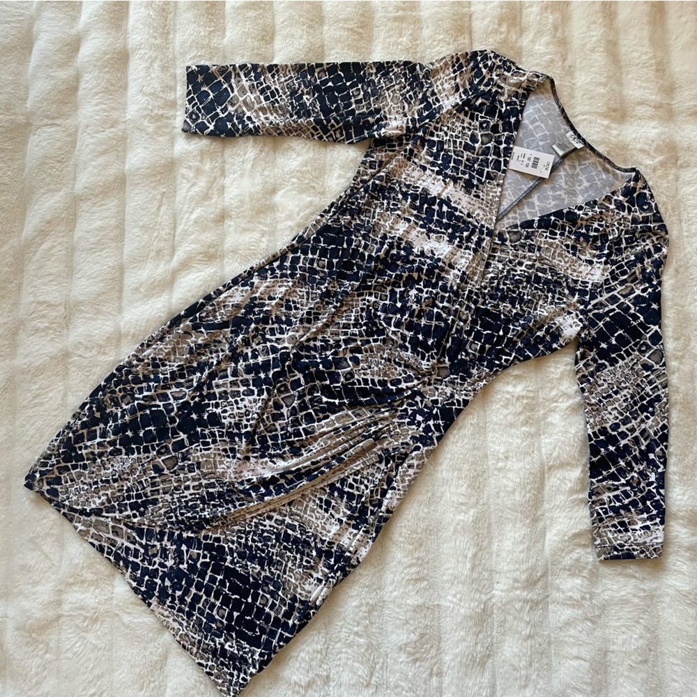 Cache Dress. Color: white, blue and dark beish. Beautiful design width 1/4 long sleeves. New never worn.