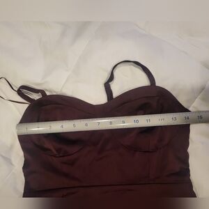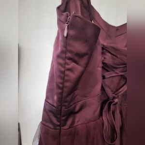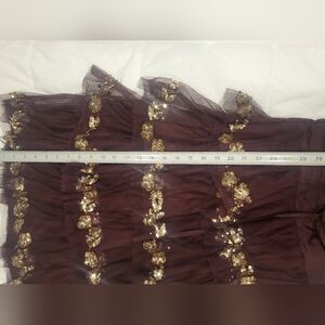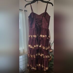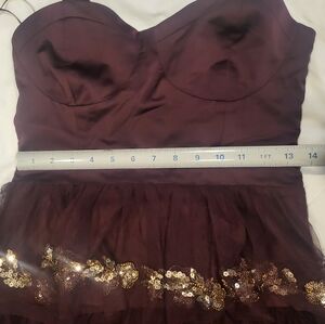 In very good pre-owned condition no noticeable flaws used once.Features a ruffled bottom with beautiful gold sequin appliques, bustier style .Sweetheart neck corset and spaghetti adjustable straps,lined in color wine.100% polyester.