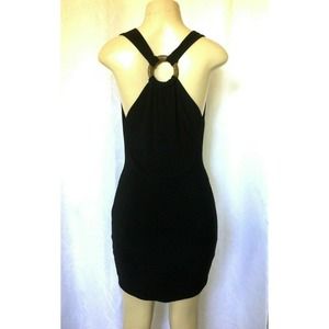 Cache Dress Fitted Draped Neck Black Mini Sheath Lined O Ring back S Jer…