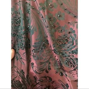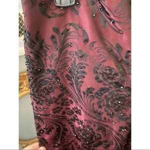 Cache Dark Burgundy Lined Pant with Black Pattern and elaborate Black Bugle Beads. Size 4. Flat front, slight flair leg. Hidden side zipper. Some beads are missing but pants are still in good condition. 100% Rayon. Lining - 100% poly
