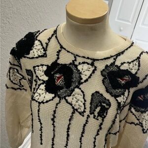 Cache Embellished Floral Sweater – Cream & Black Vintage Statement Knit (M/L)